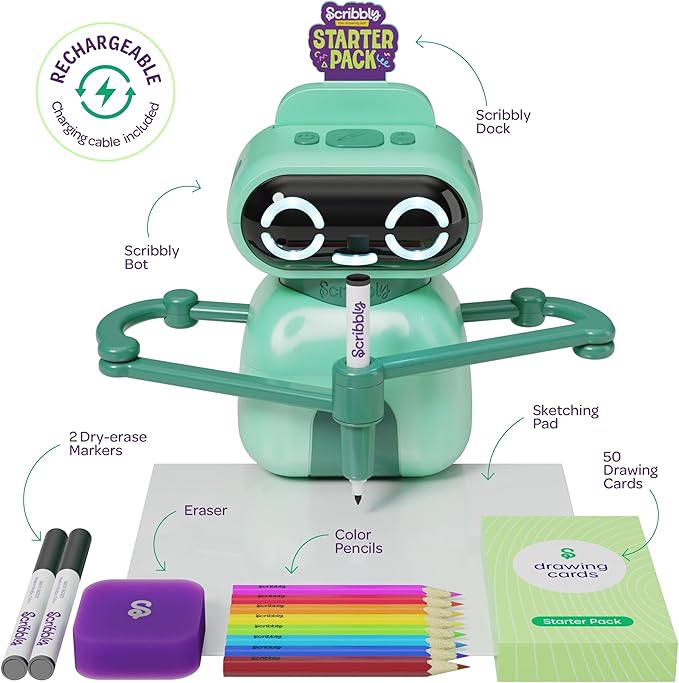 ALL-INCLUSIVE CREATIVE KIT: Comes with everything you need to start right away: Scribbly Bot, Scribbly Dock, 50 Drawing Cards, Sketching Pad, 2 Dry-Erase Markers, Eraser, 8 Color Pencils, and Charging Cable.