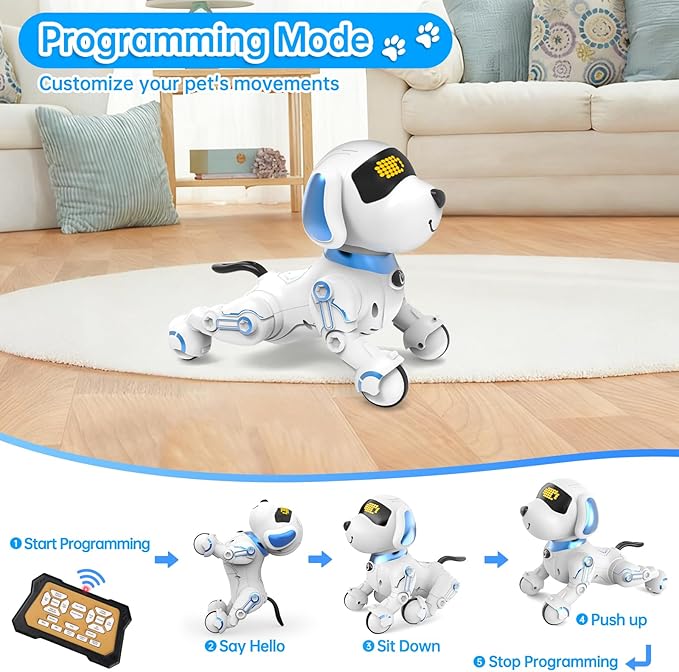 【Intelligent Programmable RC Dog】With the programming key on the remote control.Simply press the corresponding buttons for the desired actions, and the robotic dogs will display the actions in the programmed order,like forward+push+sit down+dancing or other actions.Stimulating your child’s creativity and logical thinking abilities