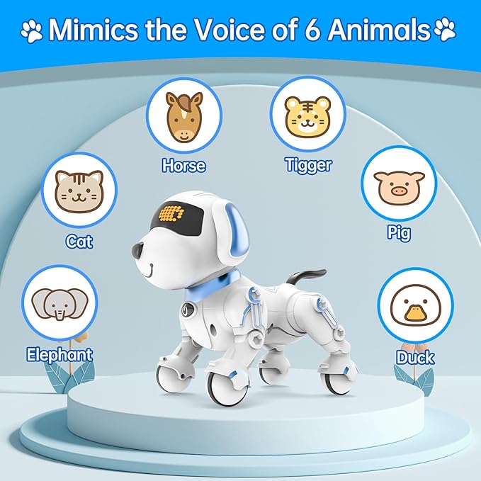 【Remote Control Dog】The robot dog is a multi-functional early education companion that can tell stories, sing nursery rhymes, dance, teach English, and imitate 6 different animal sounds.All of actions can be controlled by controller.Engages children in imaginative play & encourages social interaction